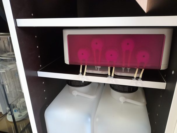 Hier eine Kundenanfertigung Meerwasser Filteranlage. Verbaut wurde hier ein Deltec Vliesfilter 5000 und ein Deltec Skimmer 600i Abschäumer. Um individuelle Filtermedien einsetzen zu können wurde noch eine Medien Filtersäule verbaut. Nachfülltank für Osmosewasser und eine Dosierpumpe im rechten Schrankteil. Aquarium online kaufen