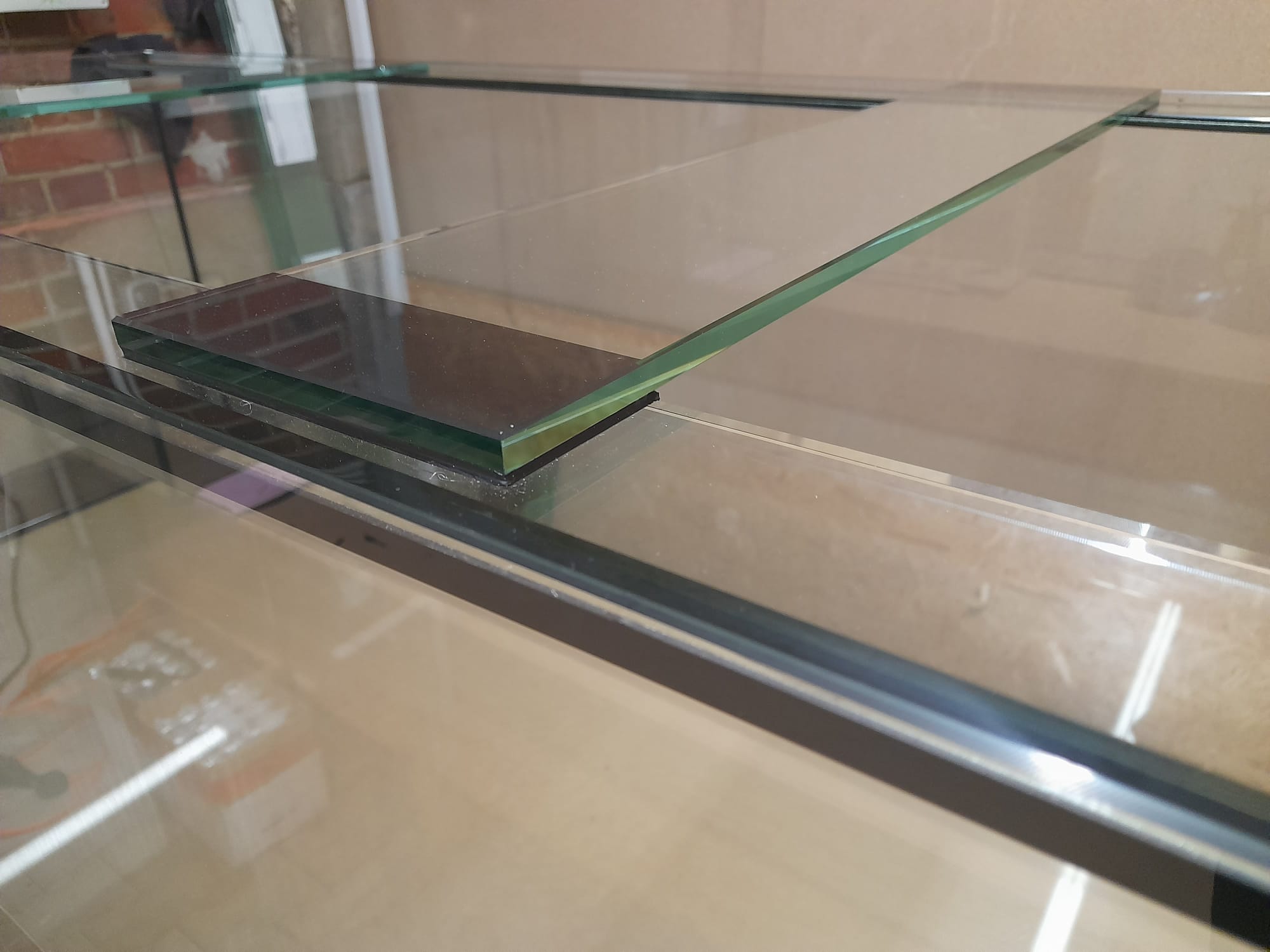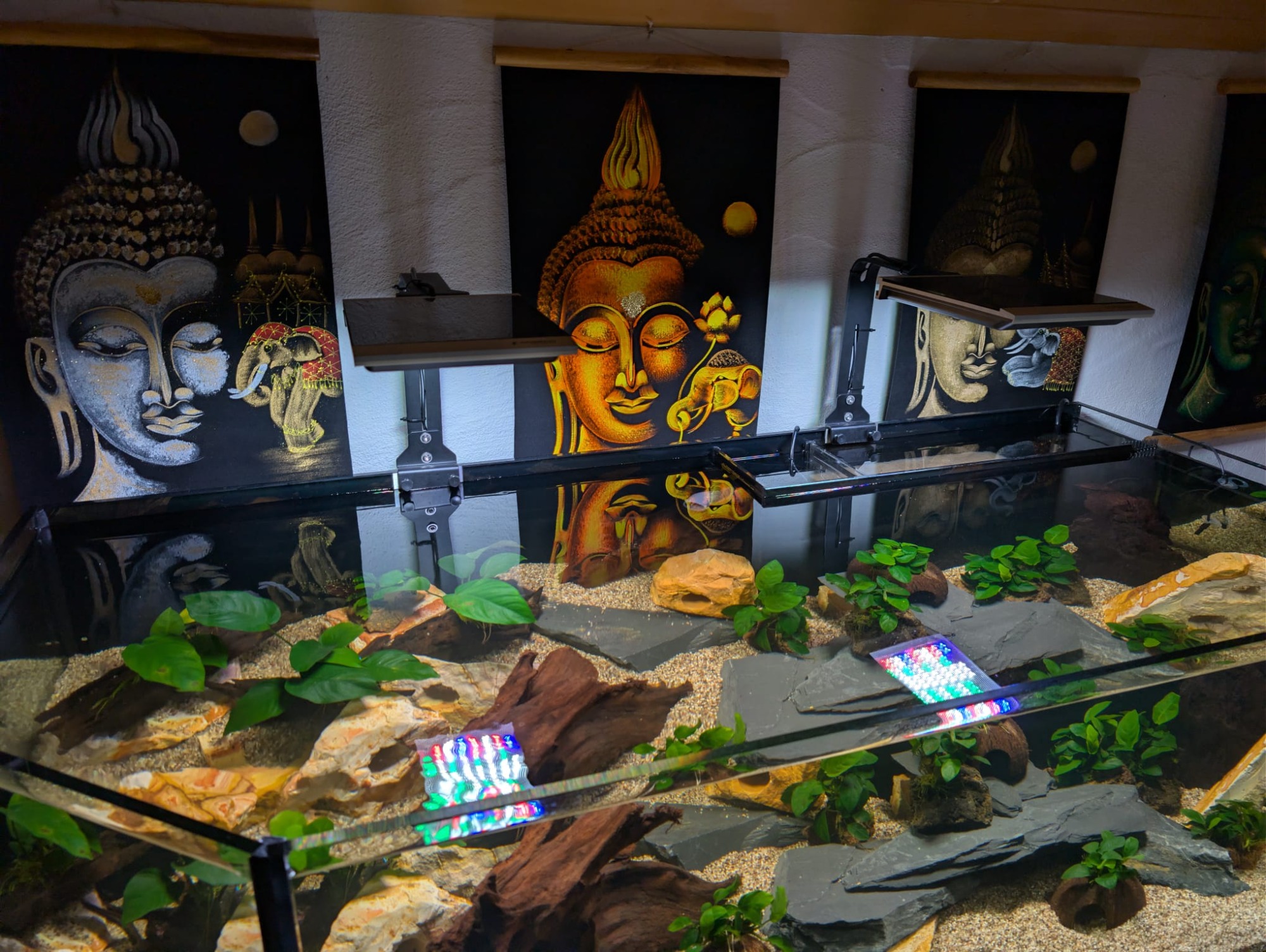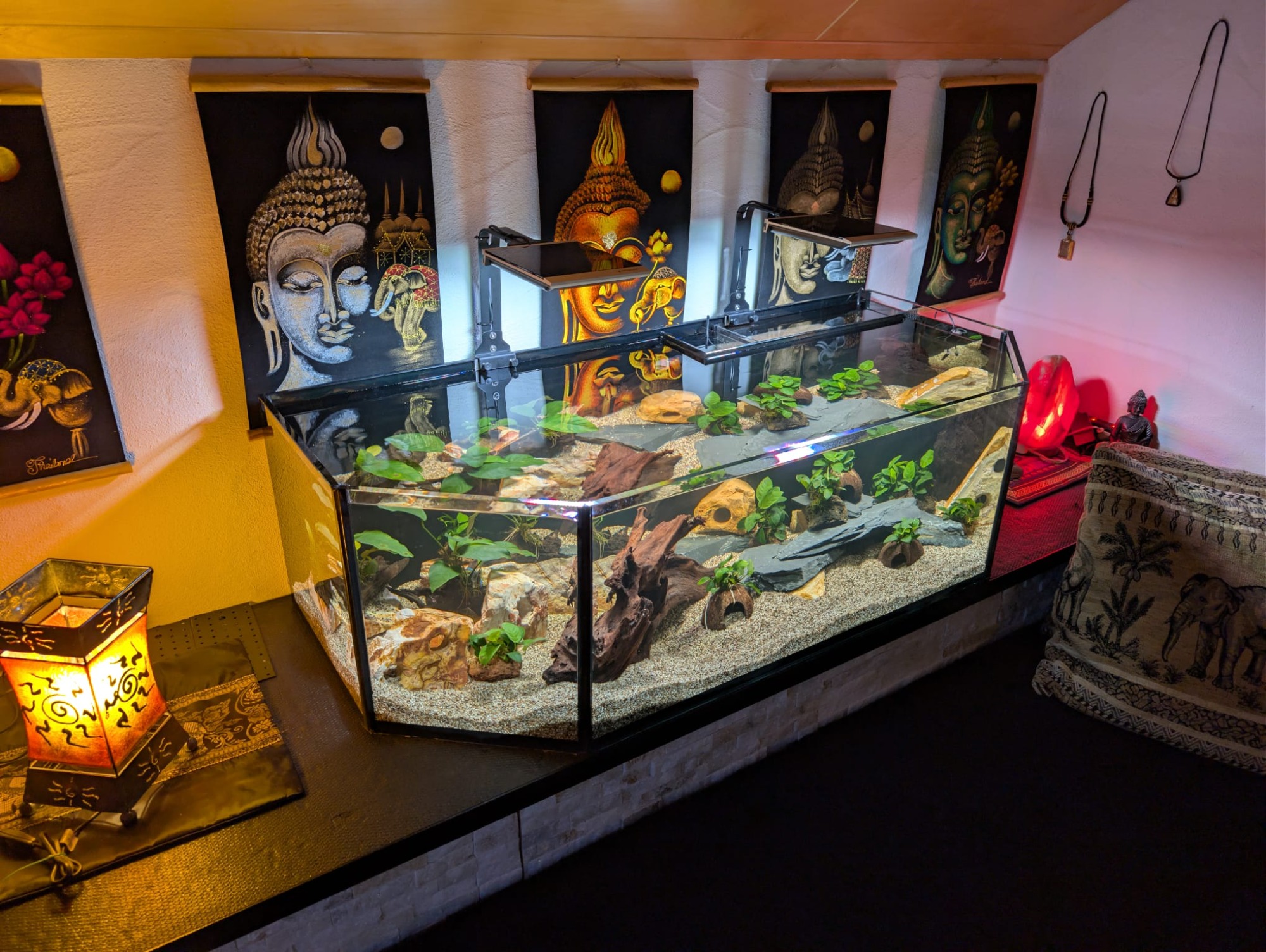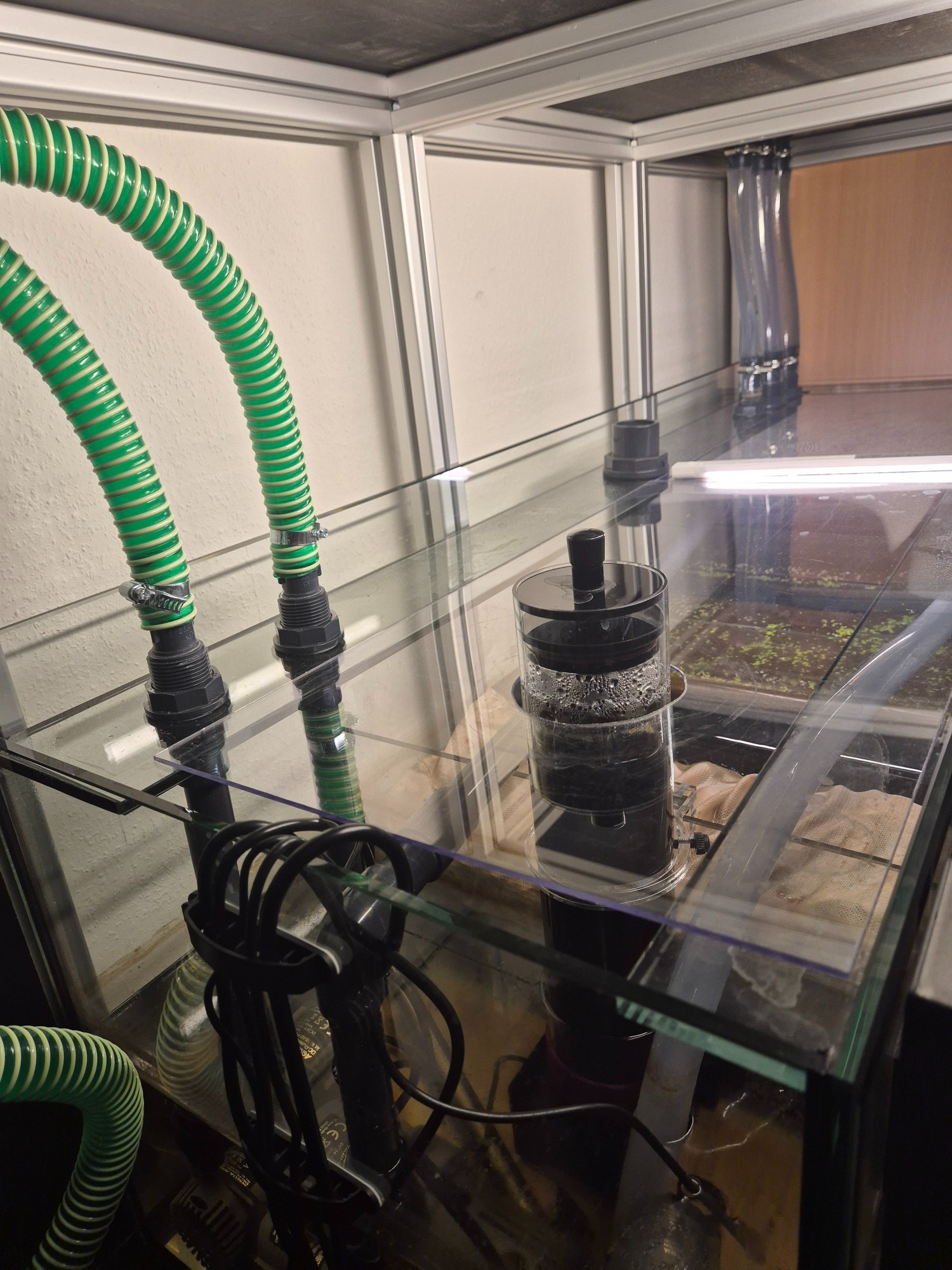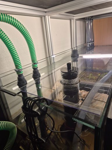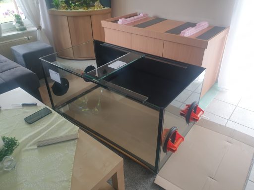 Pool Aquarium (ohne Verstrebung) in der Größe 140x60x40cm (LxTxH) gefertigt aus 12mm Glas. Hinten rechts in der Ecke wurde ein leistungsstarker 3-Kammer-Bio-Innenfilter verbaut. Als Beleuchtung wurde zwei Giesemann Minox pro Tropic LED Leuchten gewählt.