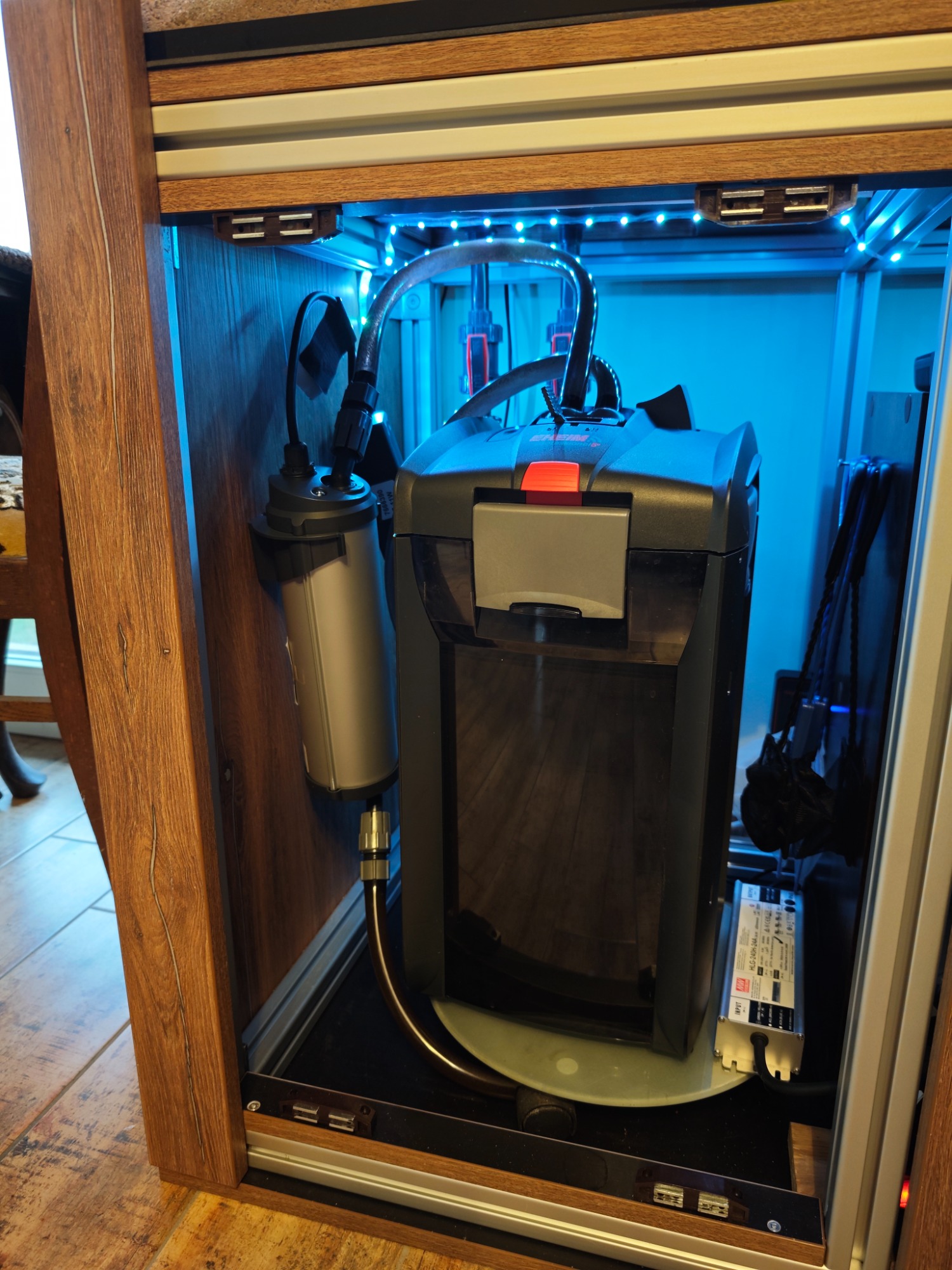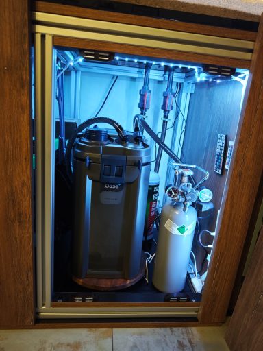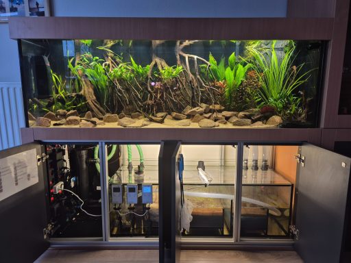 Aquarium 120cm lang der Serie Mordern mit einem Unterschrank mit Innenraum aus Siebdruckplatte. Filteranlage und Technikpaket wurde im Unterschrank verbaut. Aquarium online kaufen beim Hersteller.