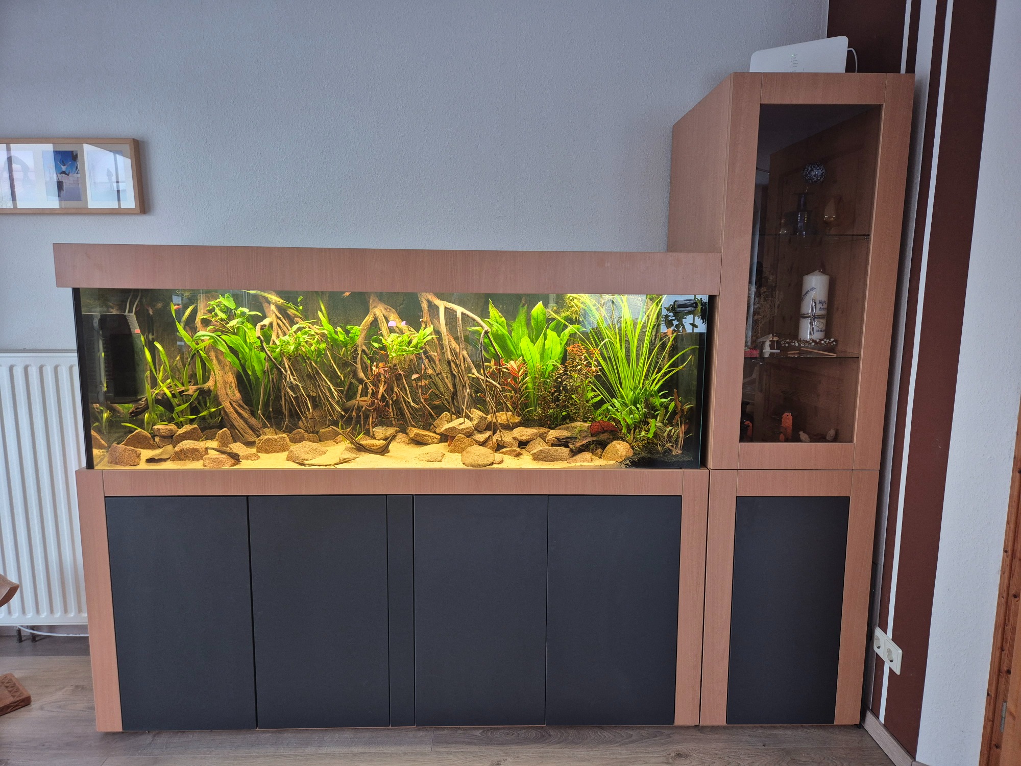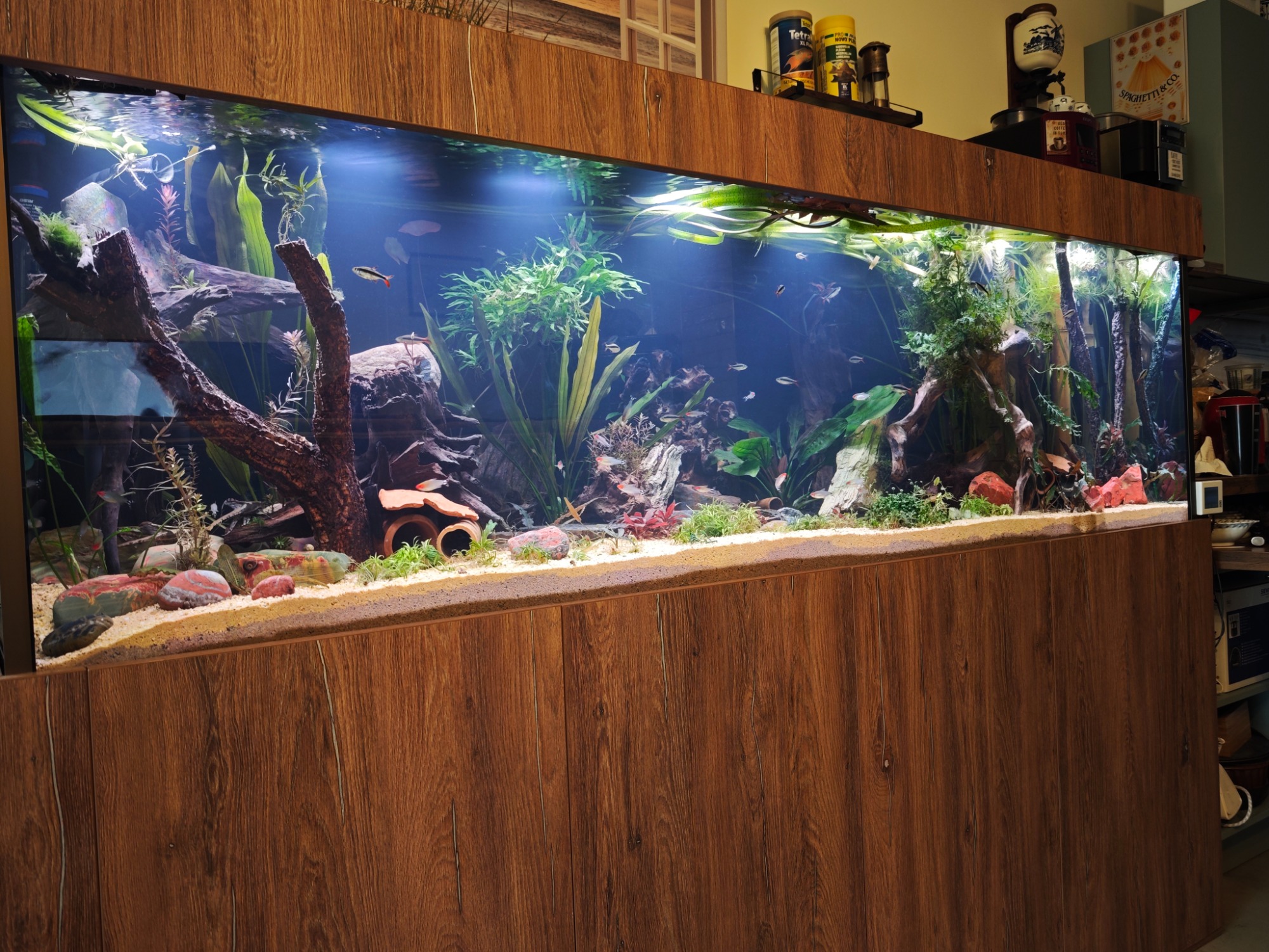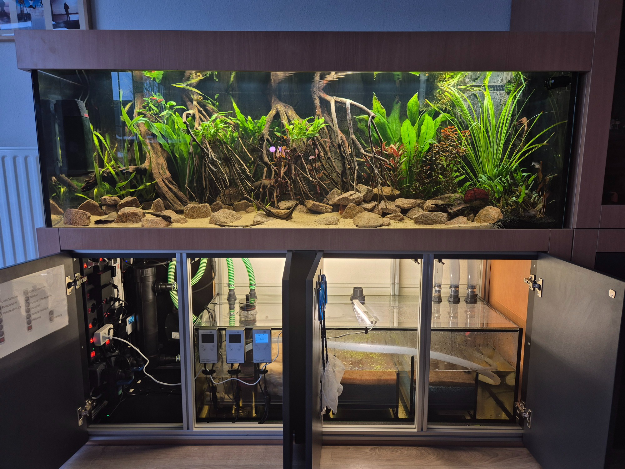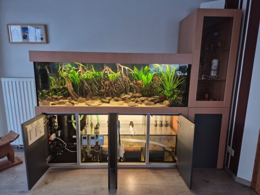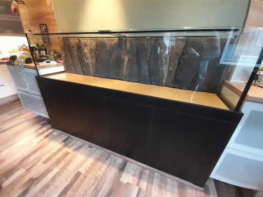 Aquarium 190 cm lang mit einer original Back to Nature Amazonas Rückwand. Die Profi Filteranlage befindet sich im Unterschrank. Überlaufschacht usw. wurde alles nicht sichtbar hinter der 3D Rückwand verbaut. Aquarium online kaufen