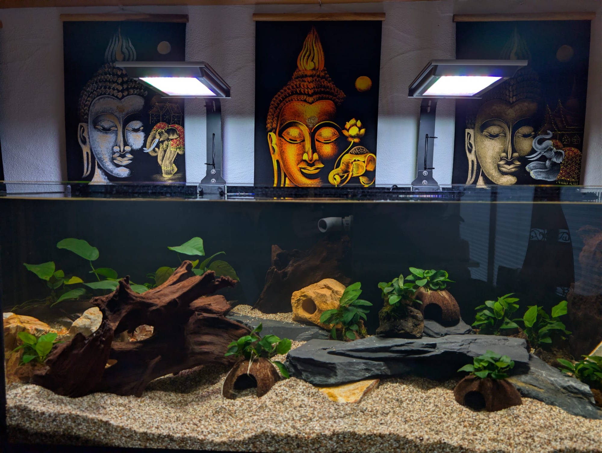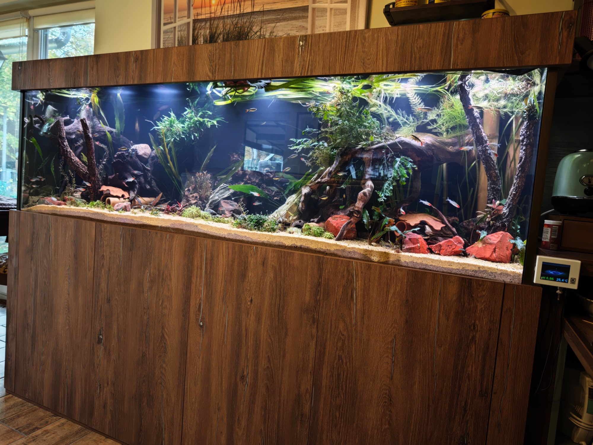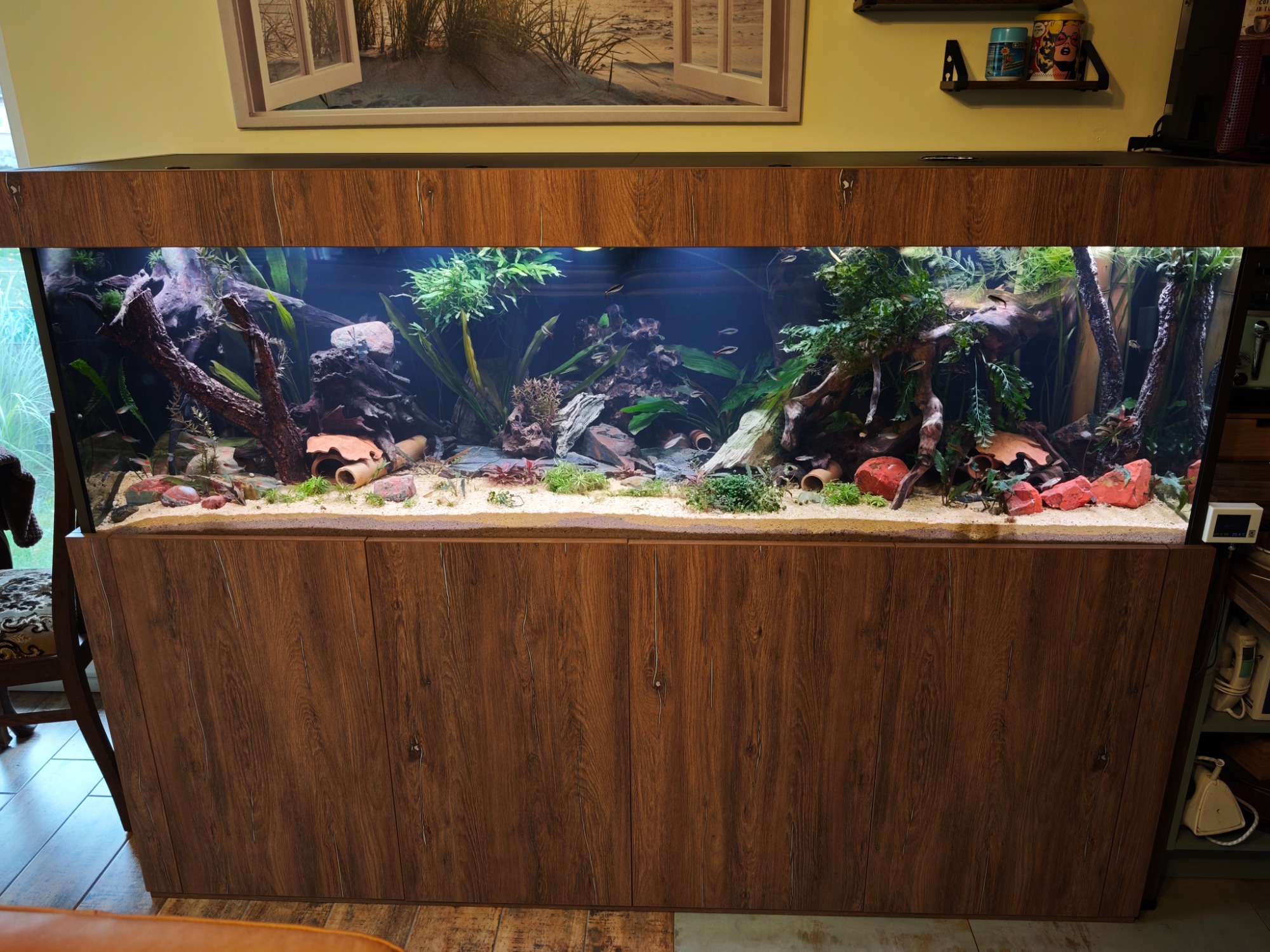 Aquarium 190 cm lang mit einer original Back to Nature Amazonas Rückwand. Die Profi Filteranlage befindet sich im Unterschrank. Überlaufschacht usw. wurde alles nicht sichtbar hinter der 3D Rückwand verbaut. Aquarium online kaufen