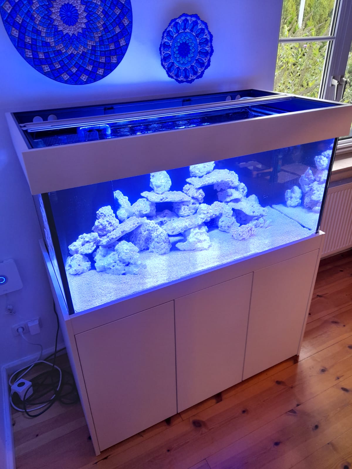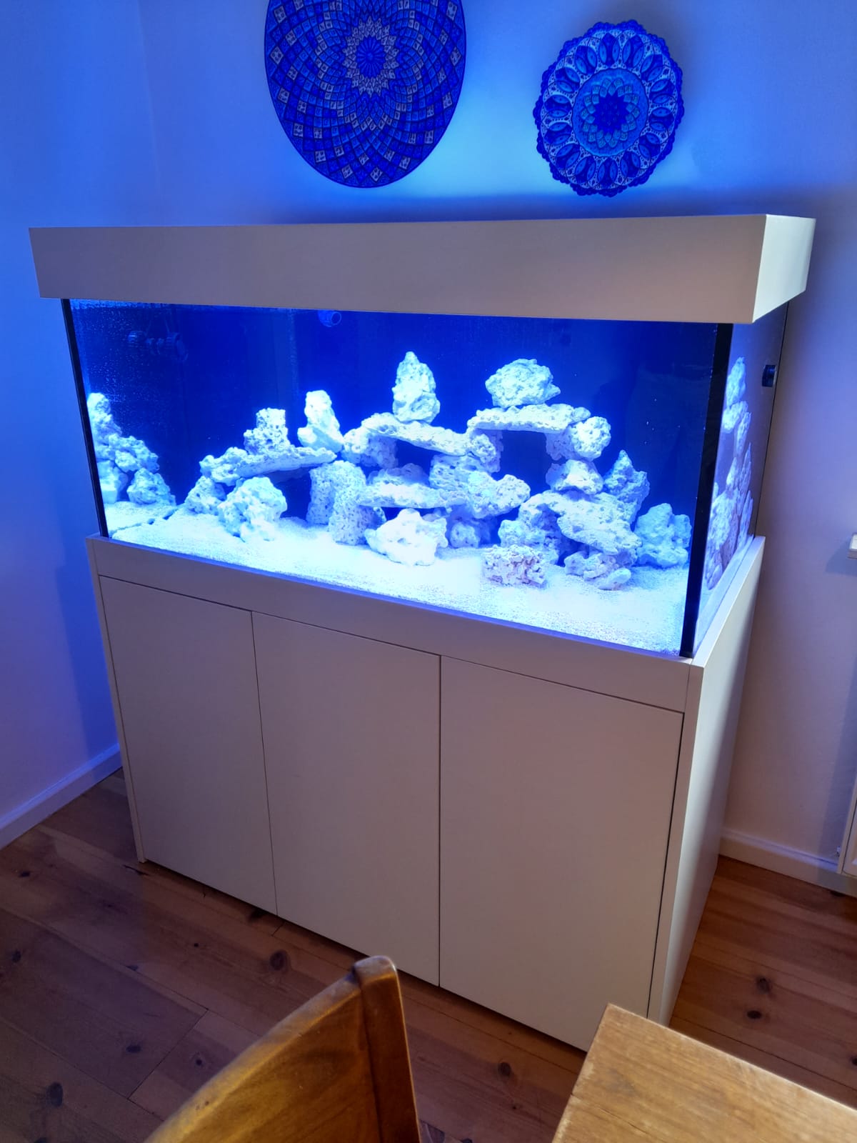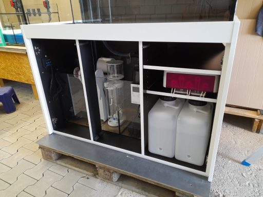Aquarium Anlage 150cm lang als Pool Aquarium. Hier entsteht eine wunderschöne Meerwasser Anlage im offenem modernen Design. Filteranlage mit Abschäumer und Vliesfilter befinden sich im Unterschrank. Aquarium online kaufen