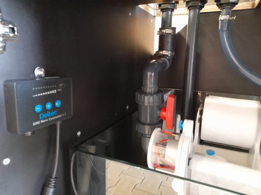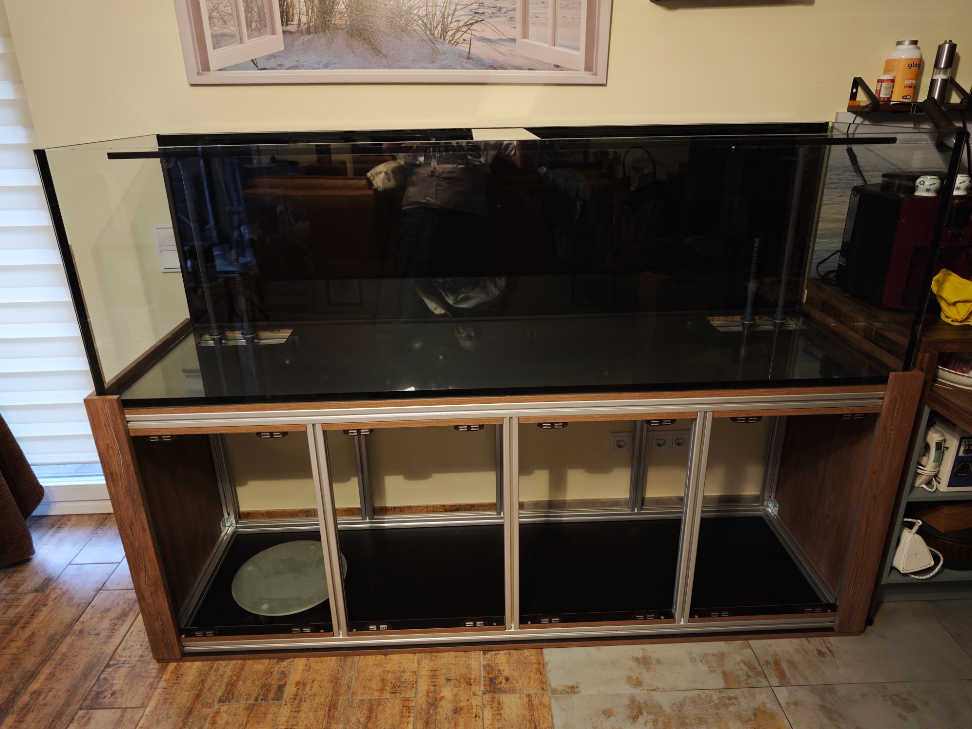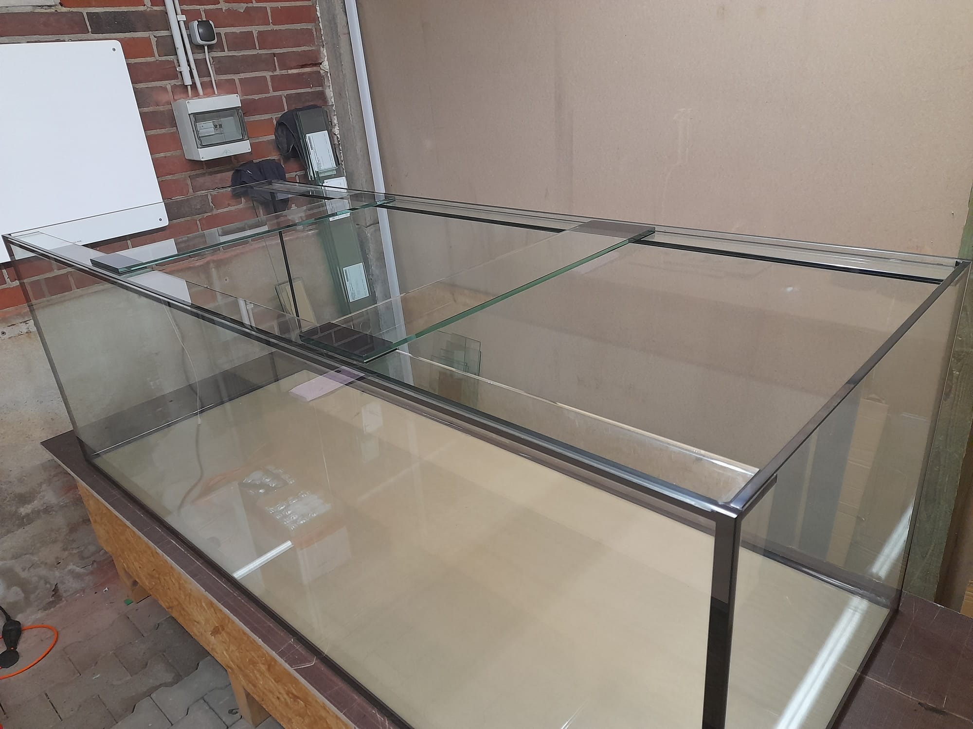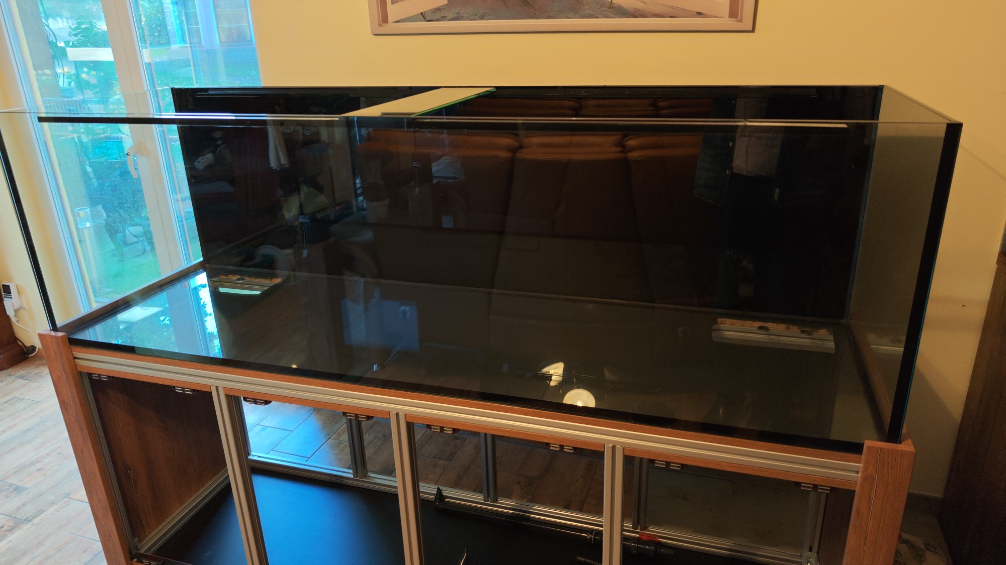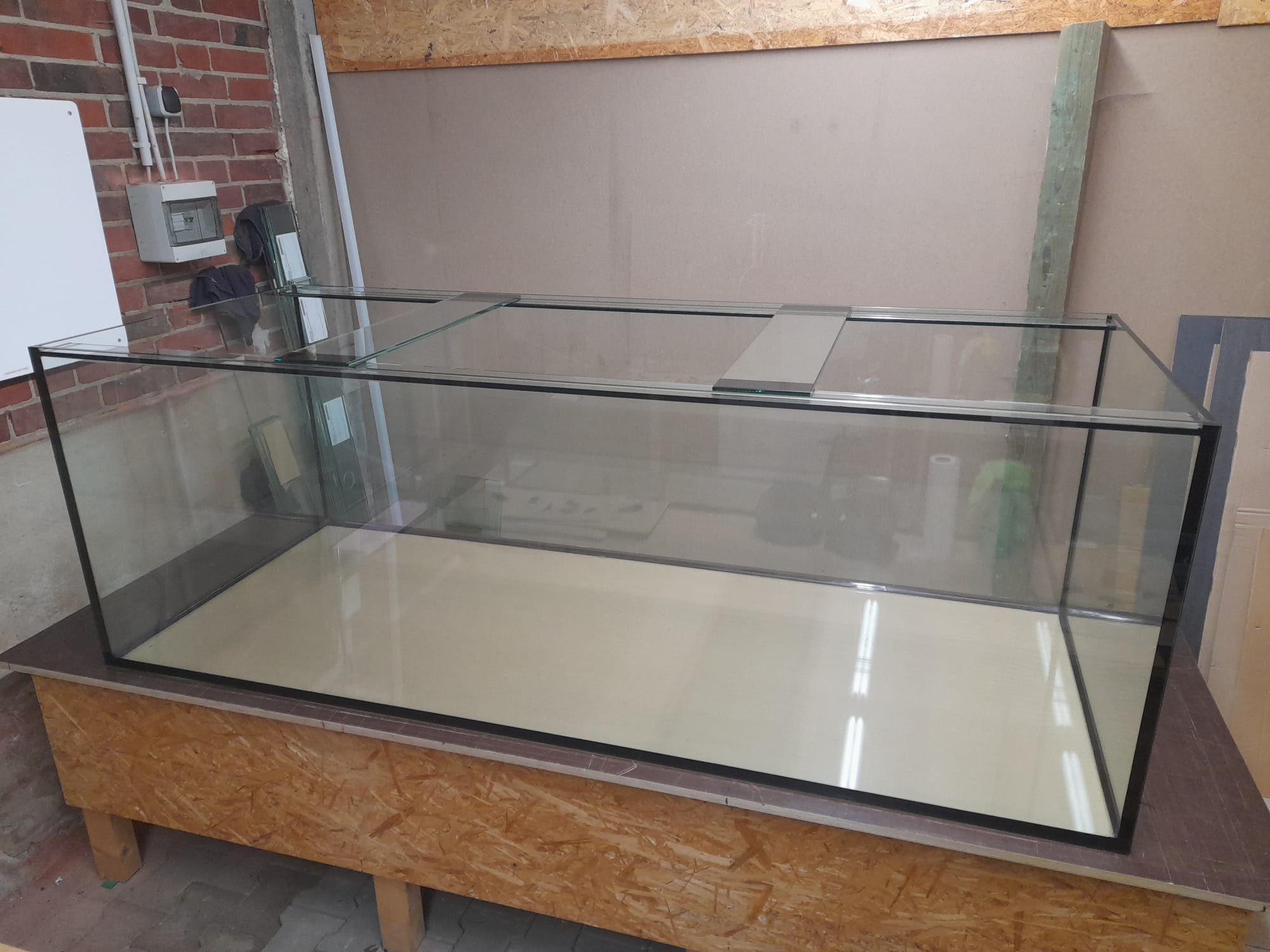 Das Aquarium hat ein Volumen von brutto 720 Litern, bei einer Größe von 200x60x60cm. Die Frontscheibe wurde aus Weißglas verbaut. Im Aquarium befindet sich hinten rechts und hinten links je ein Filteranschluss-Set für zwei Außenfilter.