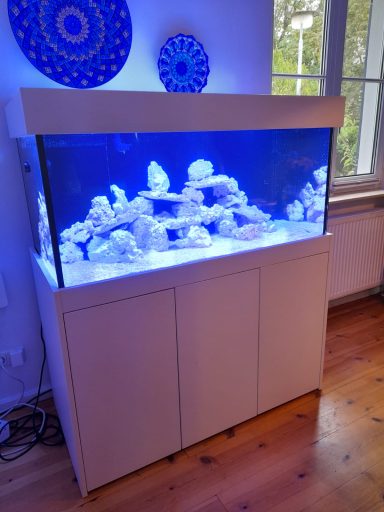 Das Aquarium hat ein Volumen von brutto 1120 Litern, bei einer Größe von 200x80x70cm. Der doppelwandige Aquarium-Unterschrank der Serie "Modern" und die Dekor Abdeckung wurden in wei0 matt angefertigt.